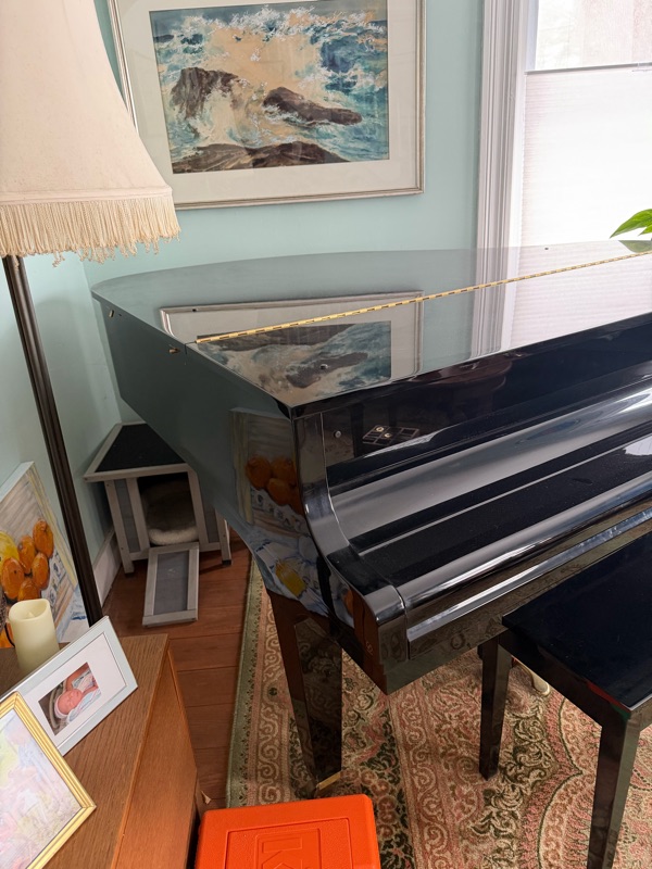 The past few times she’s made her brave journey into the unknown upstairs, she’s landed in our living room, or, as Tim calls it, the piano room. The baby grand isn’t played often these days; the ivories are only tickled when my son comes to visit, since neither Tim nor I can play a note. That makes the space under the piano a perfectly safe (and quiet) hiding spot for the cat house.
