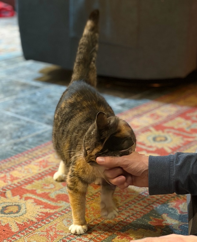 She’s not coming upstairs into the kitchen while we’re around just yet, so Tim and I are spending time in the basement family room so she can watch us from a safe distance, coming over for attention when she feels like it, on her terms. I suspect she’ll be on Tim’s lap within a week… mine might take a bit longer!