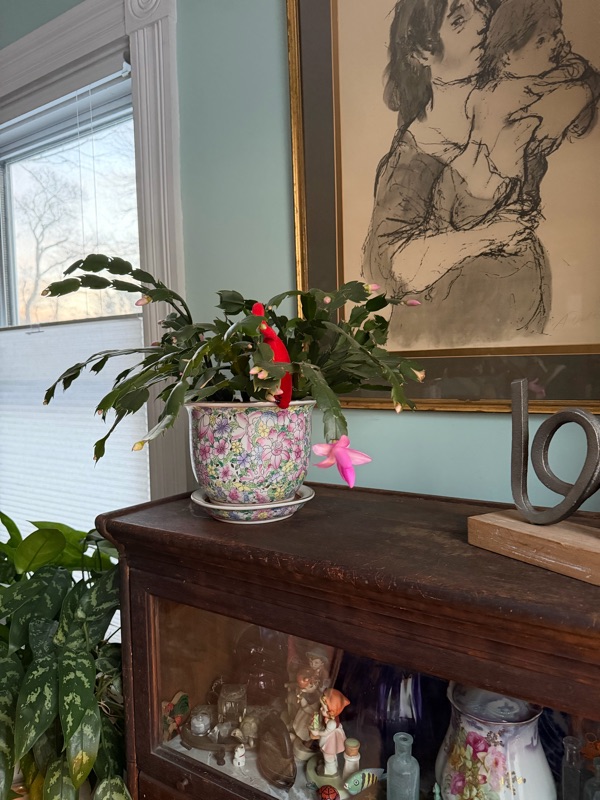 My Christmas cactus is starting to show off its beautiful pink blossoms, and apparently it’s also hanging on to a bright red cat toy! I tucked a few catnip toys into the little house under our piano, curious to see if the cat would venture out to play. Sure enough, each morning when I come downstairs, the toys are scattered everywhere, usually flipped high into the air and somehow caught on top of the piano, or, in this case, nestled right in my plant.